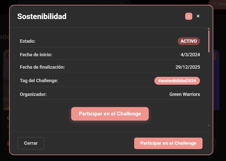 la información del challenge, esto incluye el organizador, el hashtag participante, las